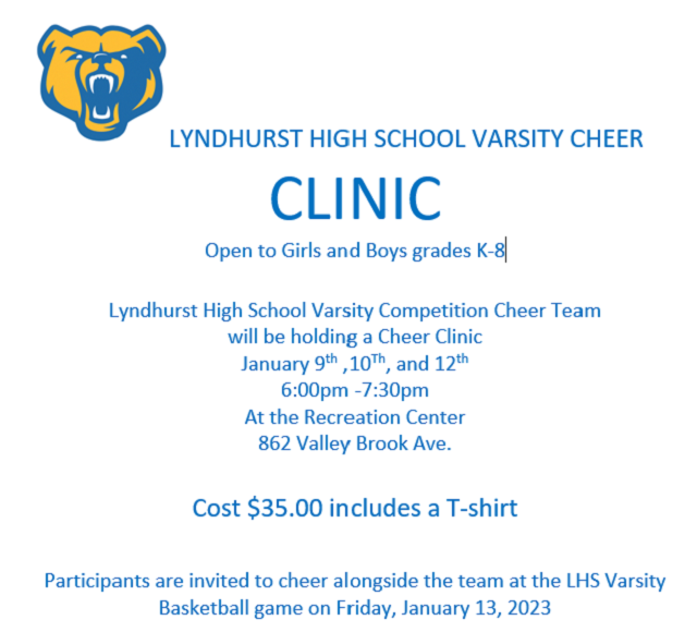 Posted November 29, 2022Lyndhurst High School Varsity Competition Cheer Team will be holding a Cheer Clinic