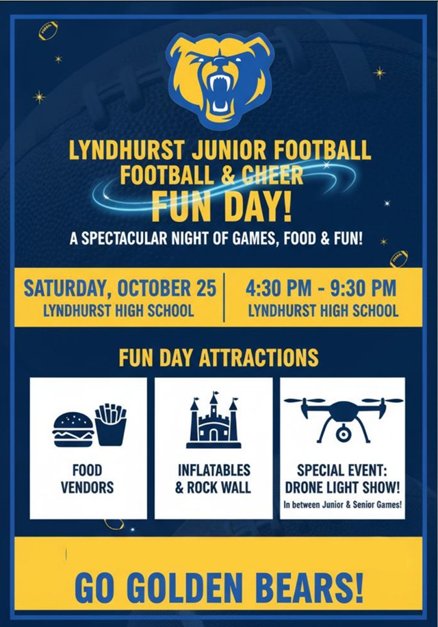 Posted October 15, 2025Get ready for a spectacular evening of games, food, and community fun as Lyndhurst Junior Football and Cheer invites families, friends, and fans to an unforgettable Fun Day celebration!
